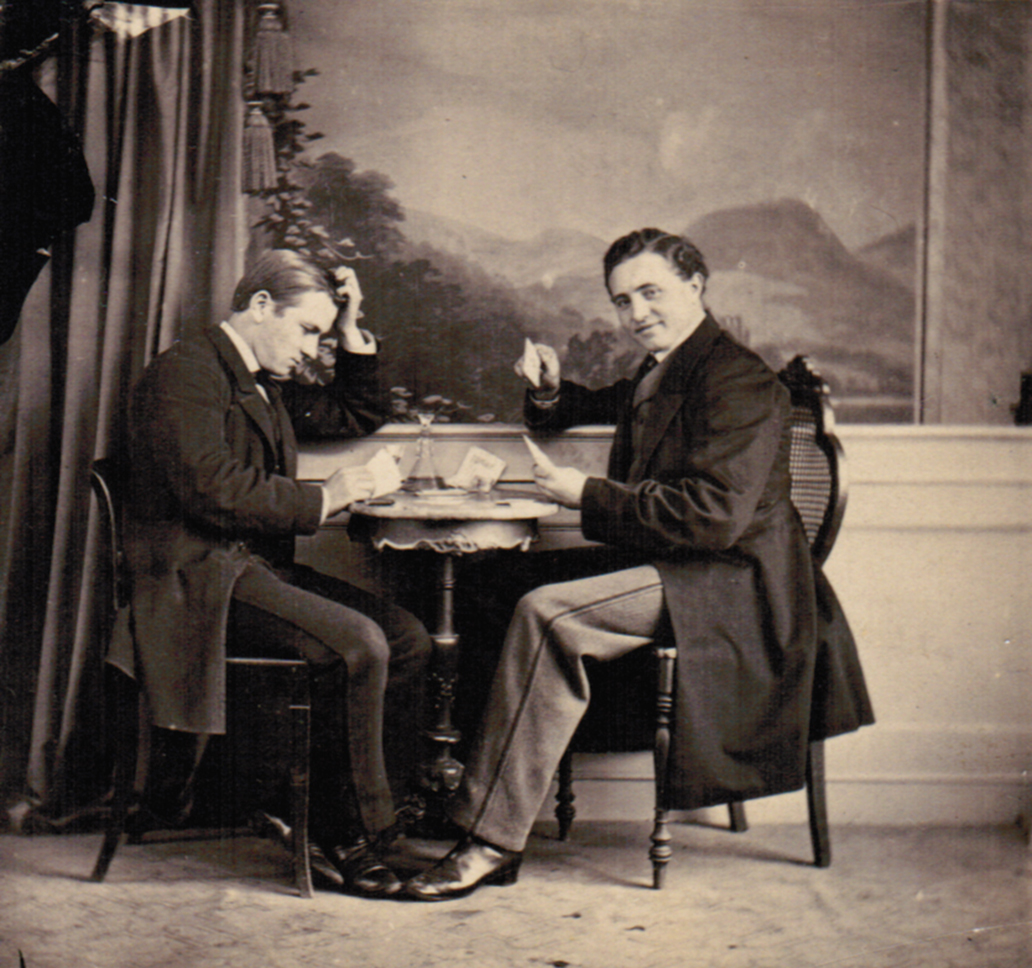 Carl, till höger, fördriver tiden i ateljén i Tyskland med kortspel tillsammans med en vän. Lägg märke till deras vackra klädsel.