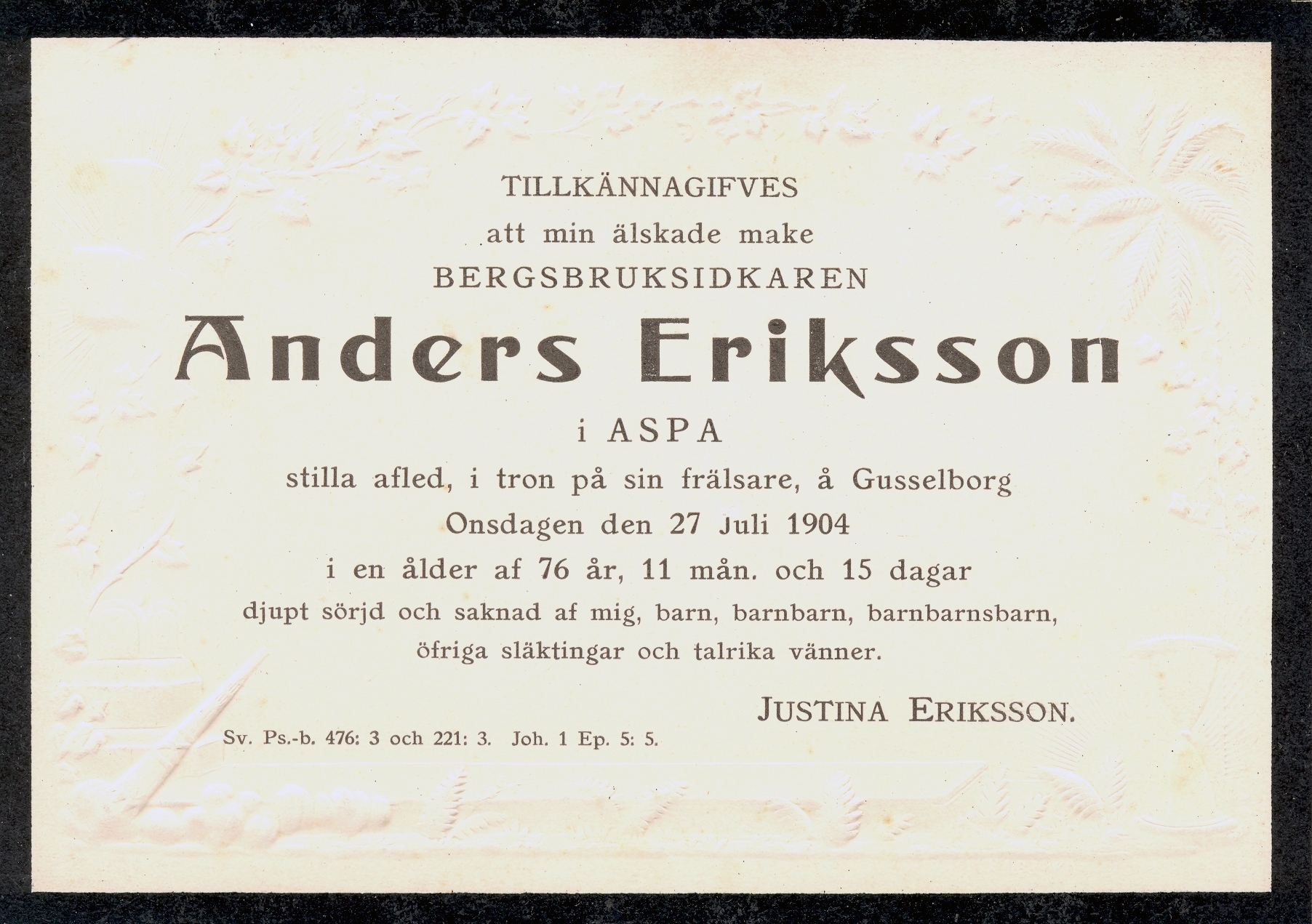 På den här tiden fanns det inte några äldreboenden, som tog hand om de gamla människorna. När man blev gammal och inte kunde klara sig längre var det ofta något av barnen som tog hand om sina föräldrar. Eftersom Elisabeth var enda barnet tog hon hand om sin far, Anders Eriksson, 1899, då han fick amputerat båda sina ben. Fadern tog denna tragedi med jämnmod. Han dog på Gusselborg onsdagen den 27 juli 1904. Han blev nästan 77 år gammal. Han begravdes den 2 augusti i Lindesberg. Elisabeths mor Justina Eriksson dog, också hon på Gusselborg, den 14 maj 1908. Begravningen ägde rum i Lindesberg den 22 maj. Hon blev 82 år gammal.
