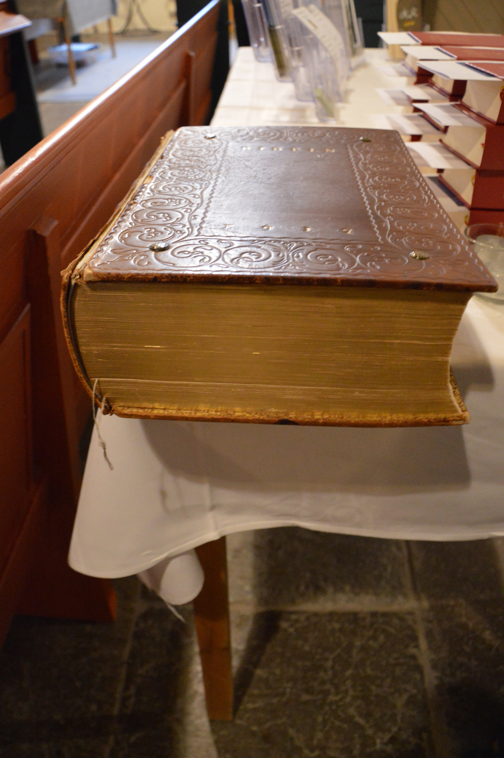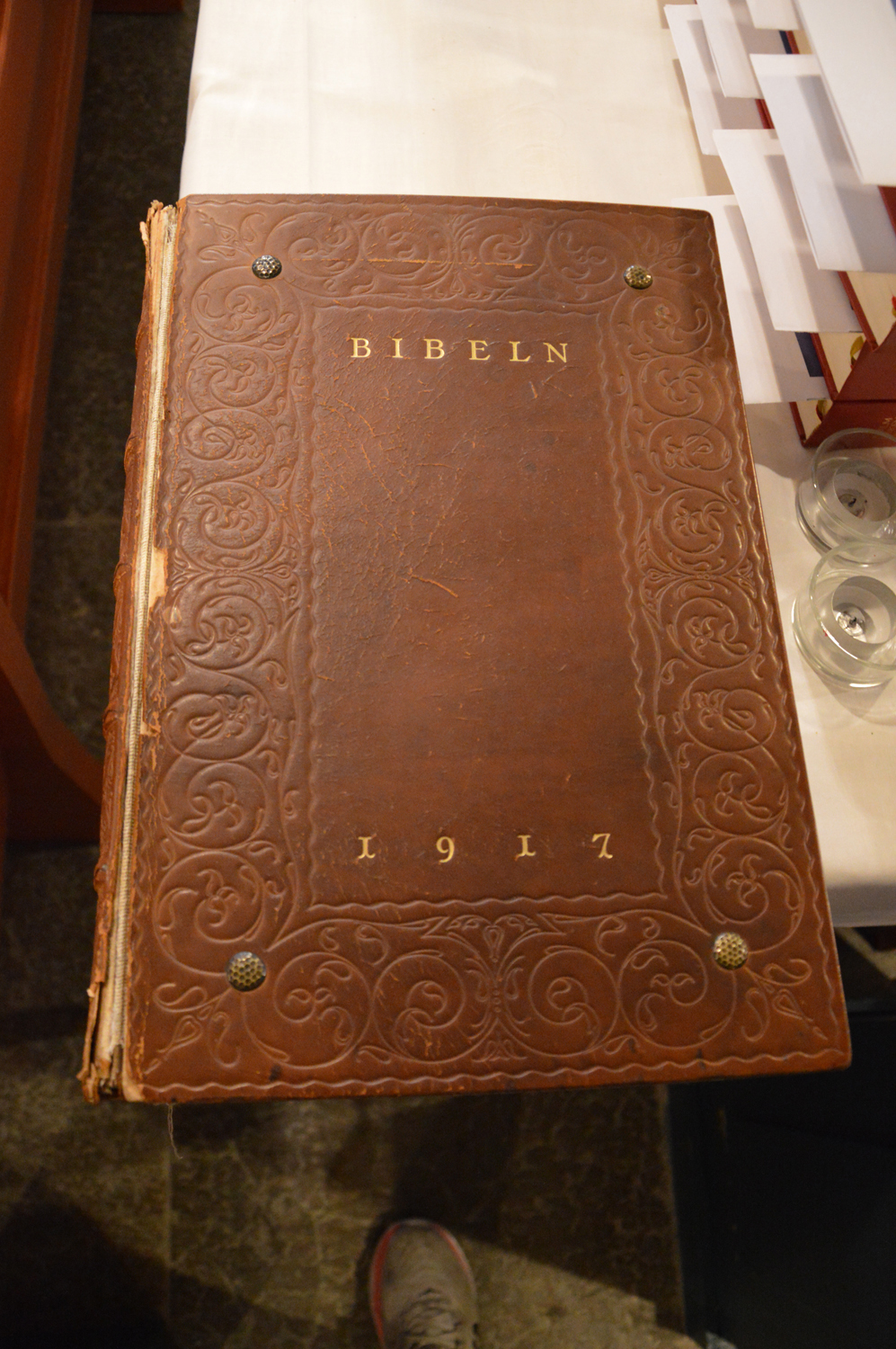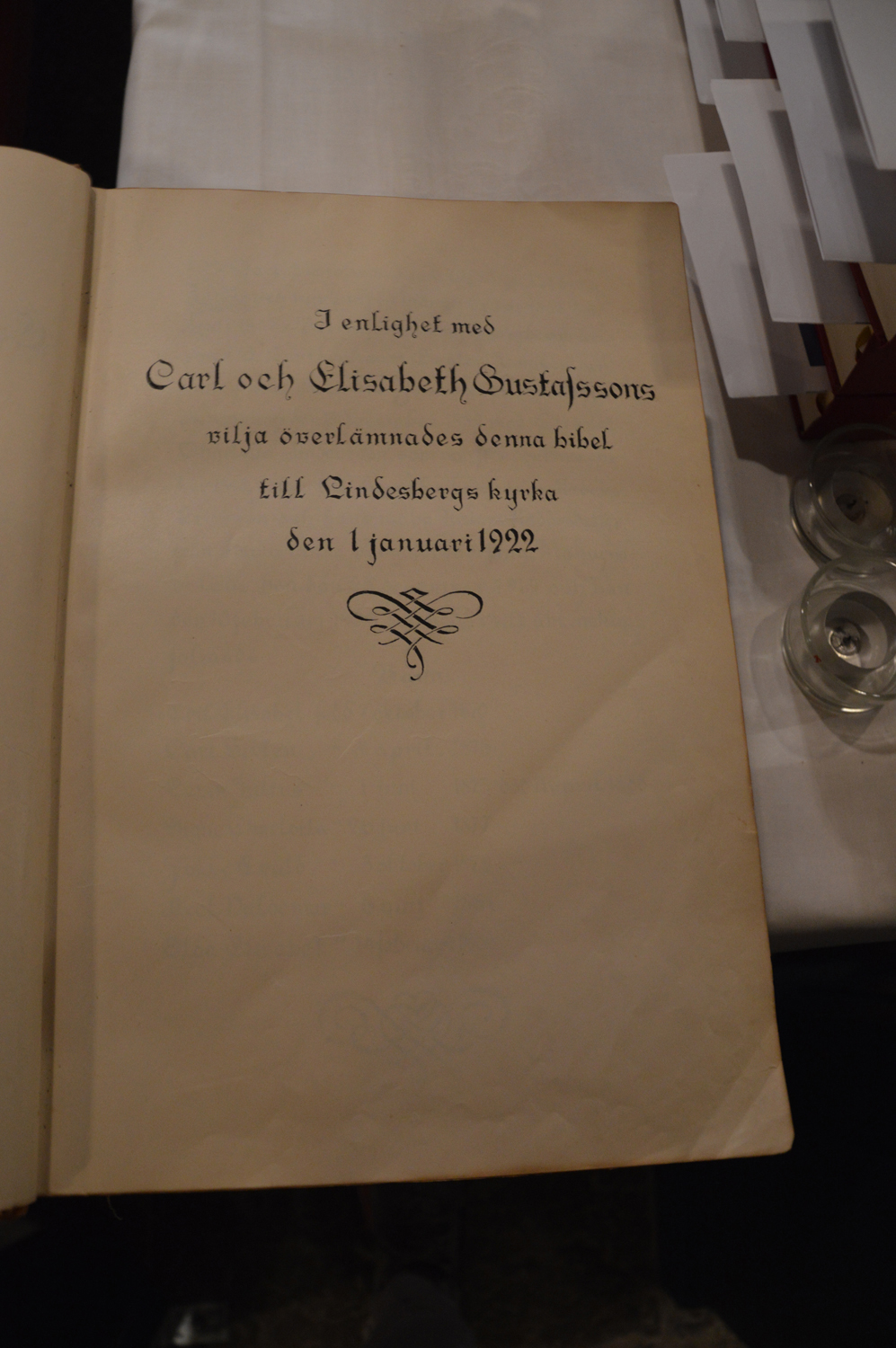Bibeln, som ligger på altarstolen i Lindesbergs kyrka, en gåva från Carls och Elisabeths barn och barnbarn på Guldbröllopsdagen