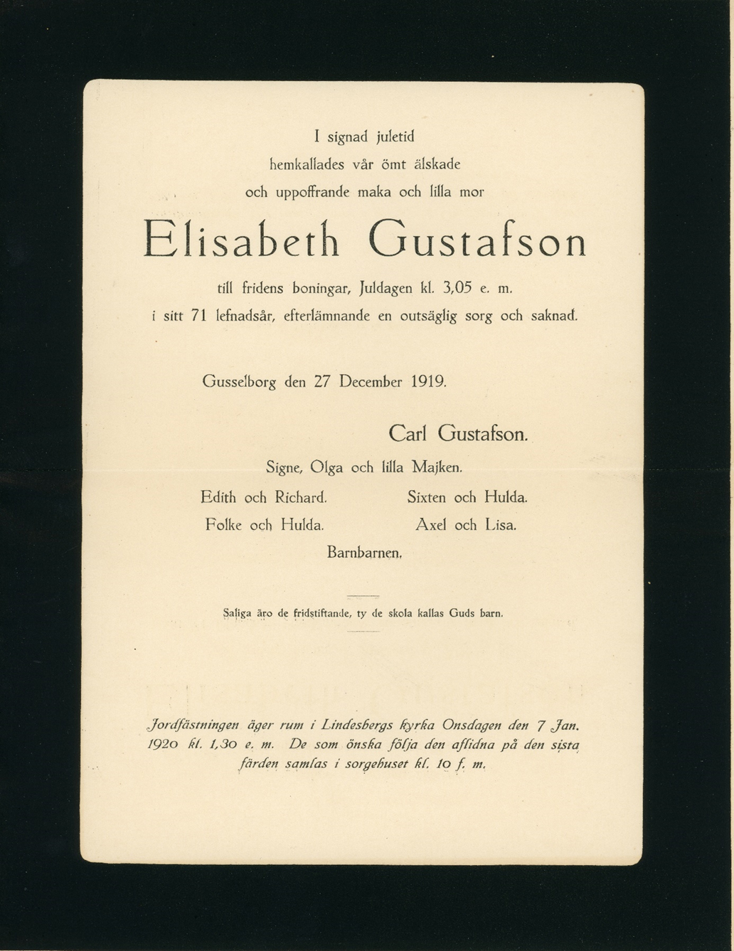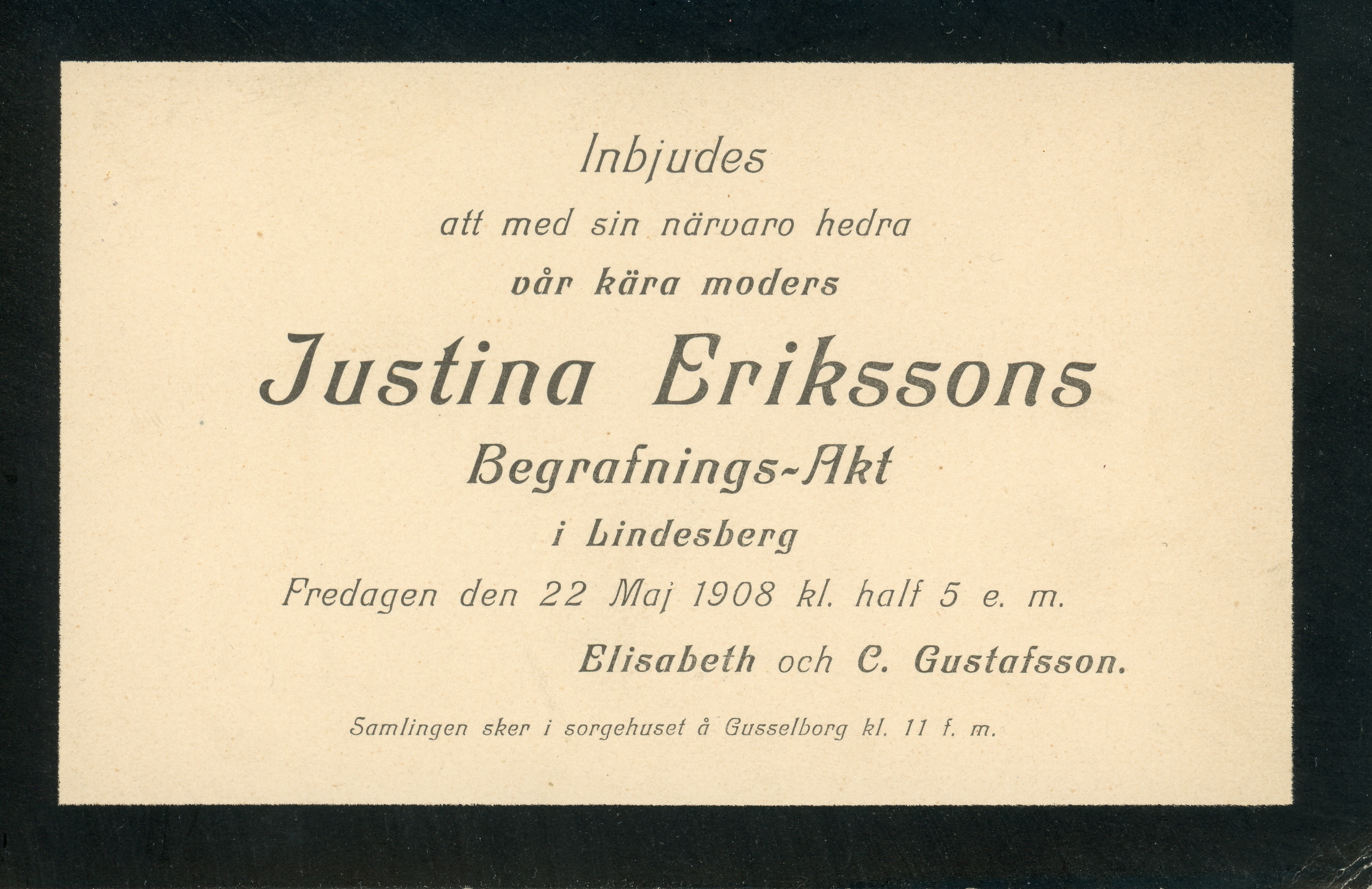 Vid begravningar var förberedelserna mycket ceremoniella. Det gjordes utskick till släkt och vänner där man inbjöd till begravningen. Både brev och kuvert hade svarta ramar. När ett sådant brev anlände visste man på förhand att det var tråkiga nyheter.